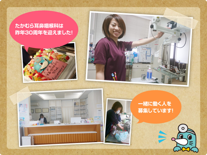 たかむら耳鼻咽喉科は、「質の高い医療を提供し皆様に喜んで頂ける、思いやりのある医療」を目指しています。昨年、開院30周年を迎えた当院は、さらに丁寧で分かりやすい医療を目指すため、新しい職員を募集しています。